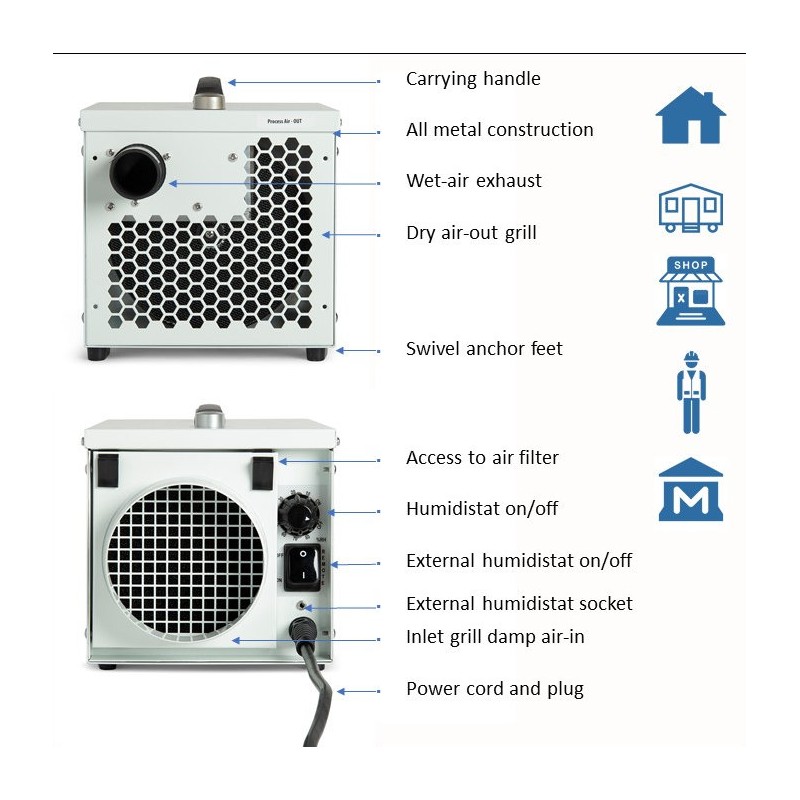De Ecor DryFan 8 PRO met innovatieve DryFan® techniek is uitgevoerd in gegalvaniseerd staal met epoxy coating. Met een ontvochtigingscapaciteit tot 8 liter/dag geschikt voor het ontvochtigen van een ruimte tot 50 m². Ideaal voor woonruimten, zolders, kelders, boten, lofts, vakantiehuizen, garages en opslagruimten. Ook geschikt als energiebesparend alternatief voor roosters in keukens en badkamers. Zelfs inbouw in een kast, kruipruimte of verlaagd plafond behoort tot de mogelijkheden.