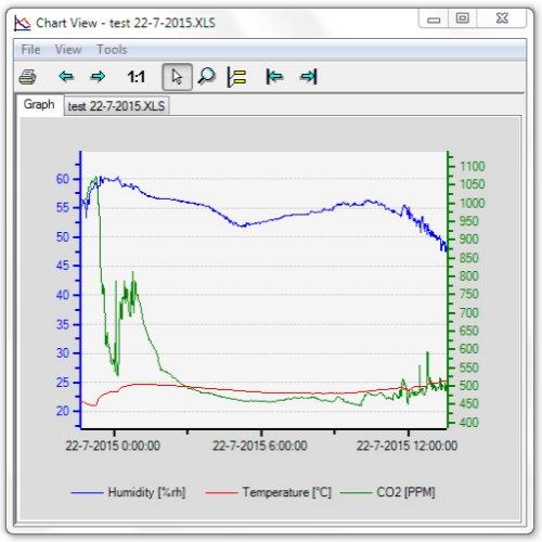 SenseAir datalogger pSENSE II: CO2 + Luchtvochtigheid + Temperatuur De SenseAir datalogger pSENSE II is een datalogger met intern geheugen om langdurig de CO2-concentratie (0-10.000 ppm), luchtvochtigheid én temperatuur te registreren. Er kunnen tot 6.000 metingen van de 3 parameters worden opgeslagen. De sample-frequentie kan worden ingesteld. De datalogger kan na de meting met behulp van de bijgeleverde software worden uitgelezen op een laptop/PC via de USB poort. De metingen worden in een grafiek weergegeven en kunnen probleemloos verwerkt worden in een meetrapport. De CO2 + Luchtvochtigheid + Temperatuur datalogger werkt op vier oplaadbare AA batterijen of op het lichtnet middels de bijgeleverde netadapter. CO2, LUCHTVOCHTIGHEID EN TEMPERATUUR DATALOGGER