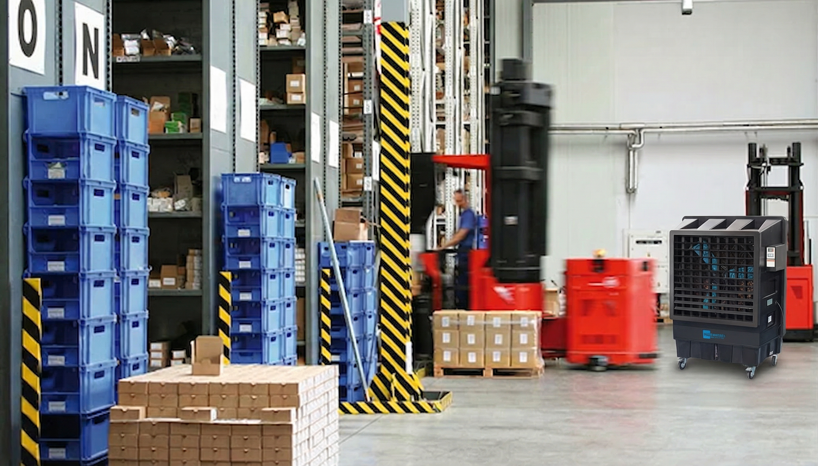 Eco Fresh Air FRE18001 voor het koelen van grote binnenruimtes, halfopen ruimtes, en buitenruimtes. Speciaal ontworpen voor het gericht brengen van koele lucht in grote, industriële en openbare ruimtes terwijl het energieverbruik minimaal is. Maximale efficiëntie tegen lage kosten! Industriële luchtkoeler StarProgetti Eco Fresh Air FRE18001 vereist geen installatie, hij kan onmiddellijk worden geplaatst en gebruikt waar hij nodig is. Verlaag de temperatuur in de omgeving met ca. 5°C/7°C, met een aangenaam oscillerend, regelbaar ventilatie-effect.
