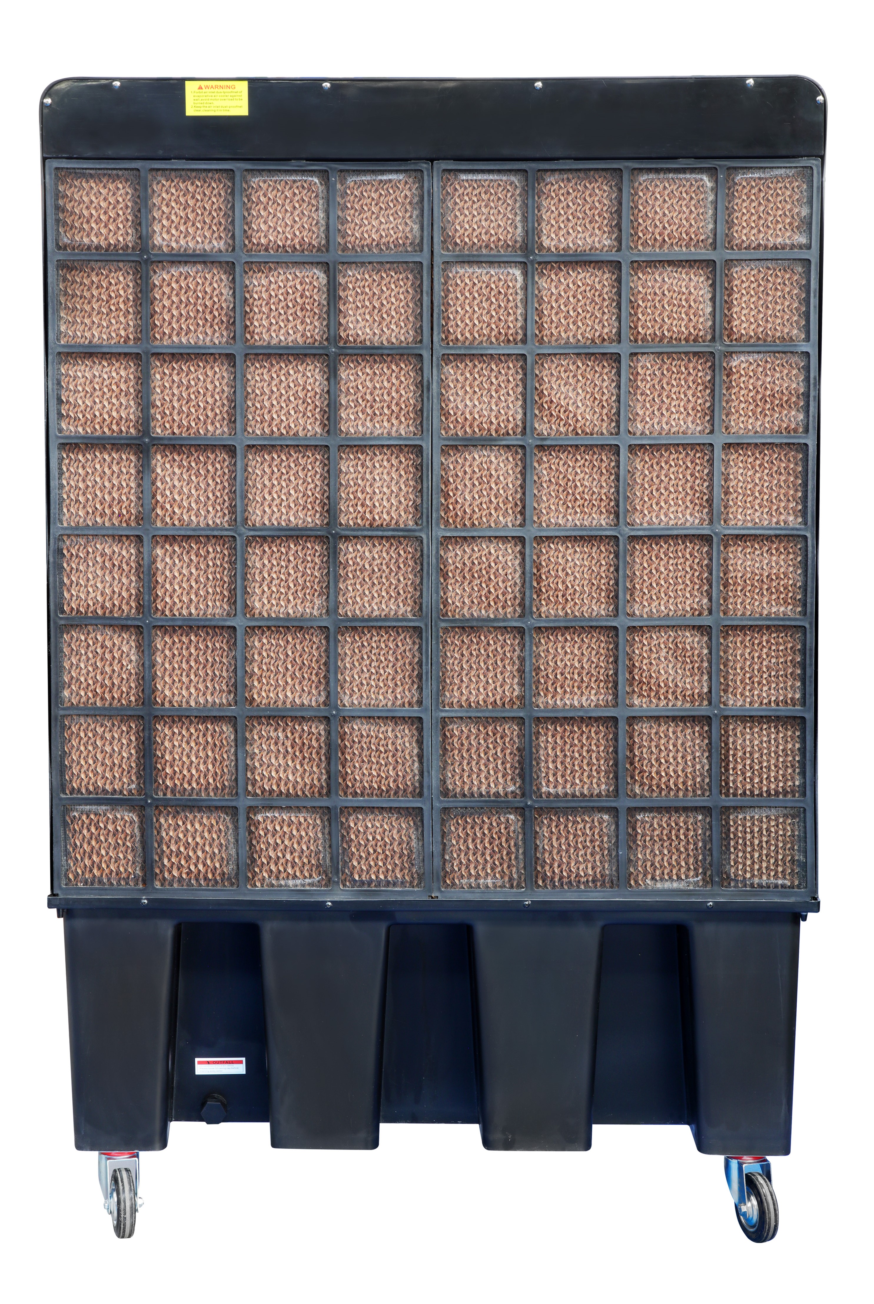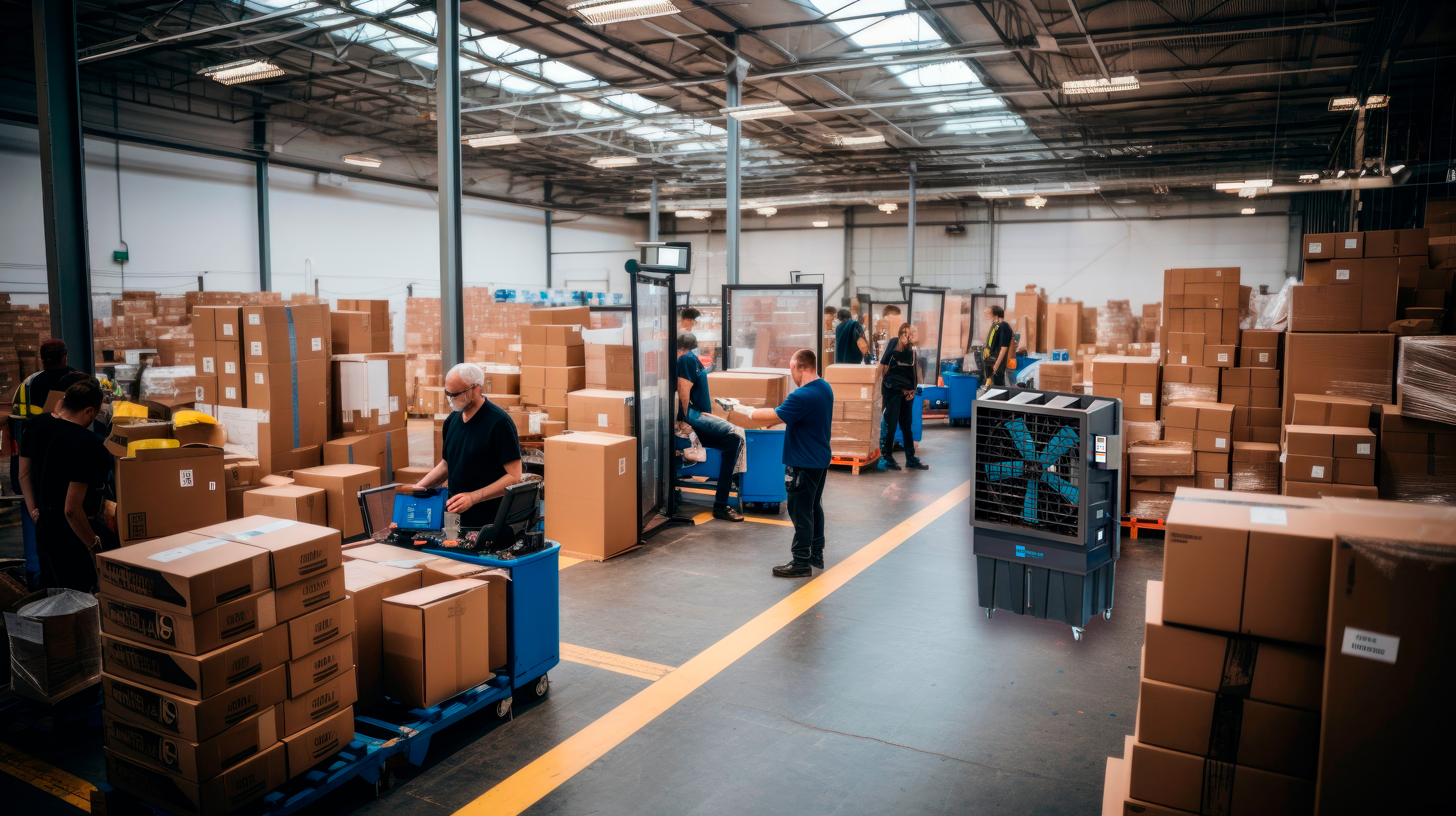 Deze koeler is in staat om een luchtstroom van 22000 m³/uur te produceren, ideaal voor gebruik in zeer grote omgevingen; verdampingskoeling, naast het verlagen van de luchttemperatuur, is in staat om schonere lucht te leveren, waardoor ook de productiviteit van de mensen in de omgeving verbetert.