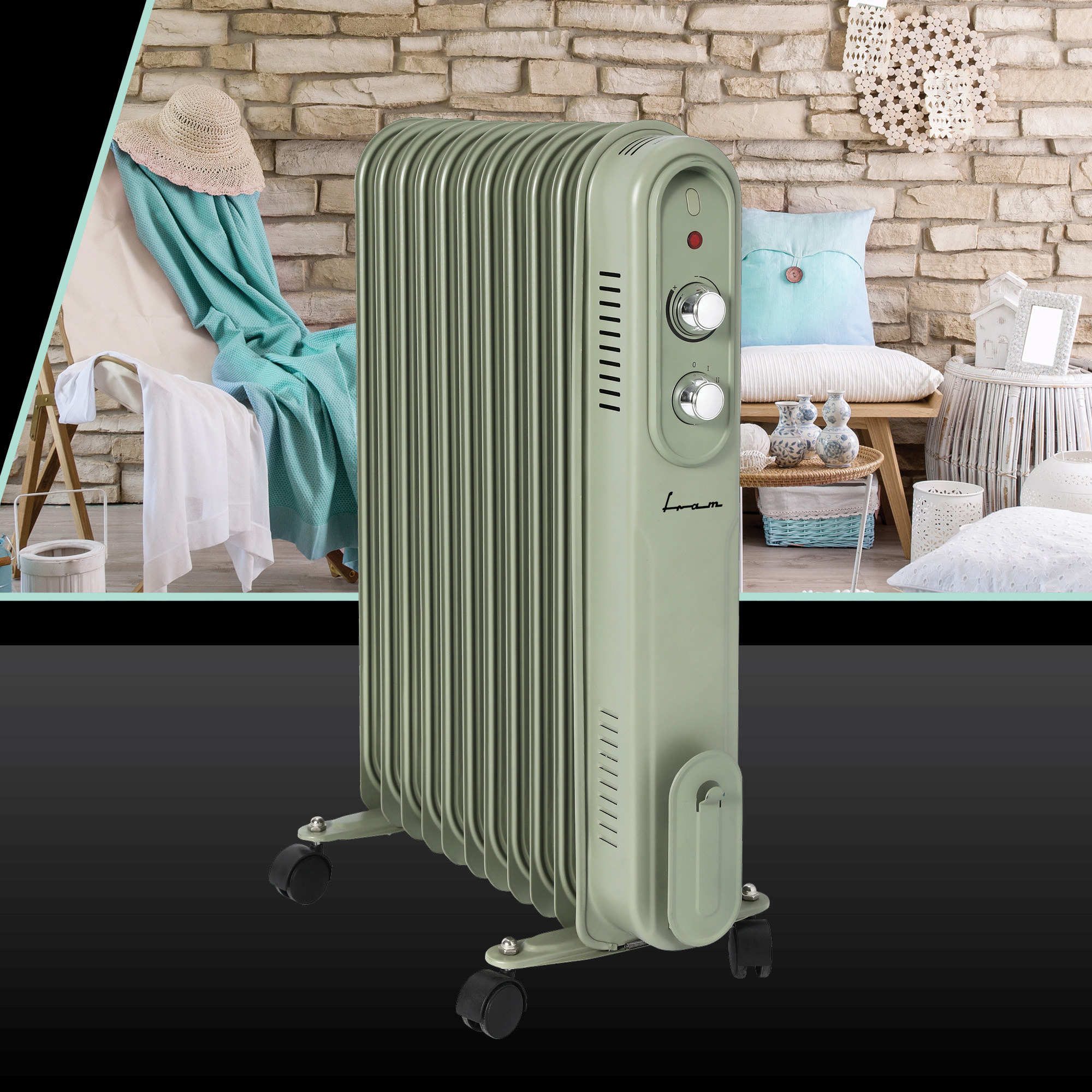 De Fram FOH-YR11GR is een olieradiator met 11 elementen van elk 110x580 mm. Het apparaat biedt drie instelbare vermogensniveaus: 1000 W, 1500 W en 2500 W, en is uitgerust met een verstelbare thermostaat voor optimale temperatuurregeling. Voor veiligheid beschikt de radiator over oververhittingsbeveiliging en een omvalbeveiligingssysteem. Dankzij de geïntegreerde wielen is het apparaat eenvoudig te verplaatsen. De FOH-YR11GR is uitgevoerd in een groene kleur.