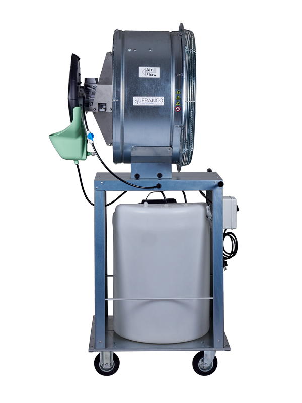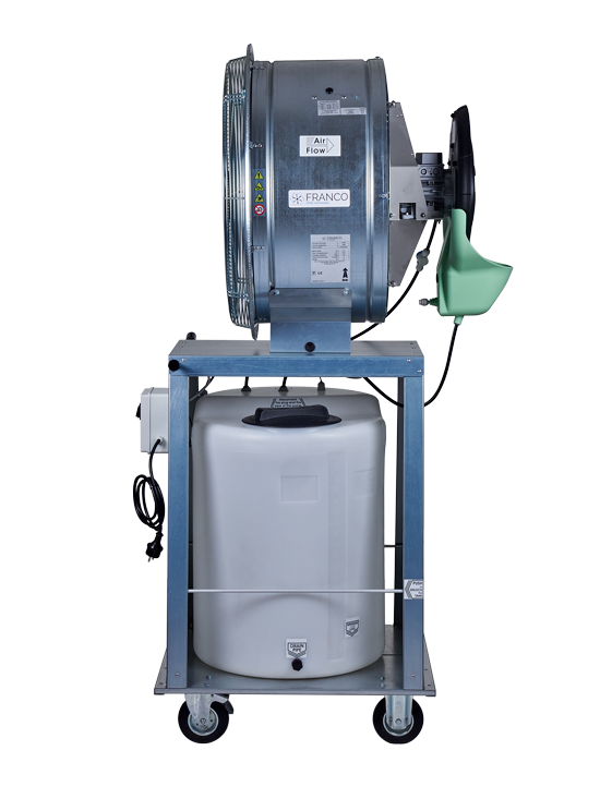 Professionele luchtbevochtiger Franco UF26 is een verrijdbare bevochtiger en koeler die breed inzetbaar is. Deze bevochtiger wordt in grote ruimtes ingezet vanwege zijn hoge bevochtigingscapaciteit tot 960 liter per dag en zijn hoge ventilatiecapaciteit. Mobiele luchtbevochtiger Franco UF26 brengt door verneveling van water tevens verkoeling (Adiabatische koeling). Industriële luchtbevochtiger Franco UF26 geeft een hoge luchtverplaatsing om een grote oppervlakte te bevochtigen of te koelen. Professionele luchtbevochtiger Franco UF26 bestaat uit een roestvaststalen omkasting en is uitgevoerd met een centrifugaal ventilator. Zowel de bevochtiger als de ventilator heeft een separate motor om maximale flexibiliteit te kunnen garanderen. De ventilatorsnelheid en de watertoevoer van de luchtbevochtiger kan daardoor apart ingesteld worden. De Franco UF26 mobiele luchtbevochtiger kan overal toegepast worden waar een goede luchtcirculatie en gedegen bevochtiging gewenst is. Toepassingen van luchtbevochtiger Franco UF26 voor centrifugaal bevochtiging en/of adiabatische koeling zijn: Kassen Opslagruimtes voor groente en fruit Opslagruimtes voor vlees en vis Industriële bedrijfshallen en opslagruimtes voor hout, papier, tabak, textiel Koelcellen Stallen Broederijen Rijpkamers / kiemruimtes Semi-open ruimtes Luchtbevochtiger kenmerken Franco UF26 is een mobiele centrifugaal verstuiver met een ventilator, aangedreven door twee motoren, dit maakt hem flexibel instelbaar en geschikt voor grote ruimtes. De verrijdbare bevochtiger is uitgerust met een separate watertank van 100 liter. De luchtbevochtiger houdt de luchtvochtigheid op niveau, ook in gekoelde ruimtes. Geschikt zowel voor bevochtiging als desinfectie. Kan ingezet worden als adiabatische koeler. De vochtafgifte kan geregeld worden door de stand van de kraanafsluiter te wijzigen. Luchtbevochtiger Franco UF26 is eenvoudig te verplaatsen en te onderhouden. Ten opzichte van een regulier bevochtigingssysteem met nozzles is bevochtiger Franco UF26 minder gevoelig voor verontreinigingen en kalkafzetting. De luchtbevochtiger is uitgerust met een recirculatiepomp. Het waterreservoir en de componenten zijn zodanig ontworpen dat snelle inspectie en reiniging mogelijk is. De watertank wordt afgesloten met een stevige deksel. De vernieuwde vlotter is eenvoudig los te maken en af te stellen. De pomp is bevestigd met een snelkoppeling zodat deze eenvoudig losgekoppeld kan worden tijdens onderhoud. Na gebruik altijd de watertank leeg laten lopen i.v.m. Legionellabestrijding.