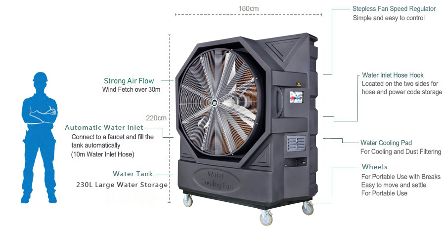 De Ya Suh Dar M502-COOL verdampingskoeler is een mobiele, adiabatische luchtkoeler voor commercieel gebruik. Dit toestel maakt deel uit van de Ya Suh Dar-serie en is bijzonder geschikt voor het koelen van zowel binnen- als buitenruimtes. Het plug-and-play toestel zorgt voor aangename temperaturen in fabrieken, industriële en productieomgevingen, restaurants en hotels. Geschikt voor oppervlakken tot 500 m² met een luchtcirculatie van 48.000 m³ per uur. Een adiabatische koeler koelt niet alleen de omgevingslucht, maar filtert ook stof en vuildeeltjes.
