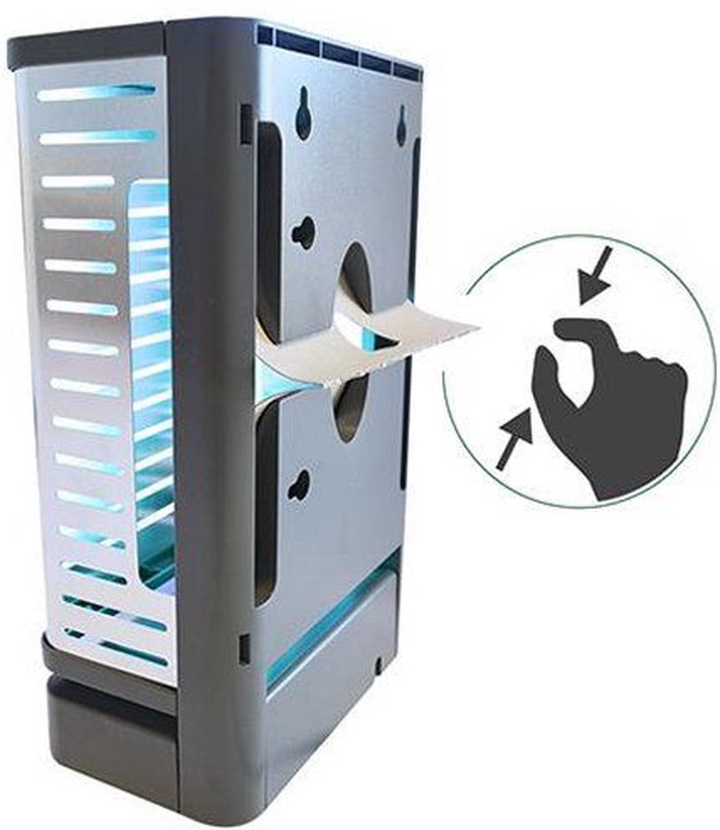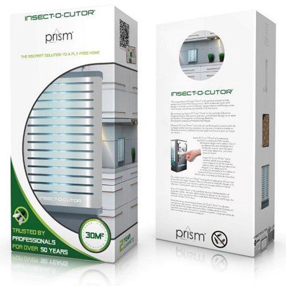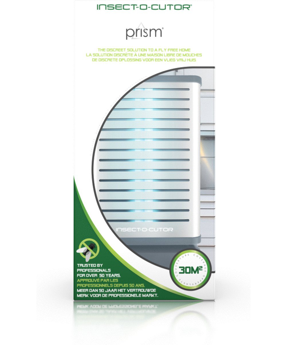 De Insect-O-Cutor PRISM™ insectenvanger (Zilver) is een discrete en hygiënische oplossing voor het bestrijden van hinderlijke insecten. Deze innovatieve insectendoder combineert hoge prestaties met een eigentijds design. Het lijmplaatapparaat is uitgerust met een uiterst efficiënte 11 watt UV-lamp en de gepatenteerde Glupac®-kleefplaat met UV-stabilisator. Het werkingsbereik bedraagt 30 m². Het doordachte ontwerp van de Insect-O-Cutor PRISM™ UV-vliegenvanger (lichtuitstraling naar boven, voren en opzij) zorgt voor een effectieve aantrekking van insecten. Het toestel is eenvoudig in gebruik en het onderhoud is zeer gemakkelijk. De PRISM™ kan zowel staand als aan de muur worden gebruikt, geschikt voor particuliere of commerciële ruimtes zoals woonkamers, serres of keukens.
