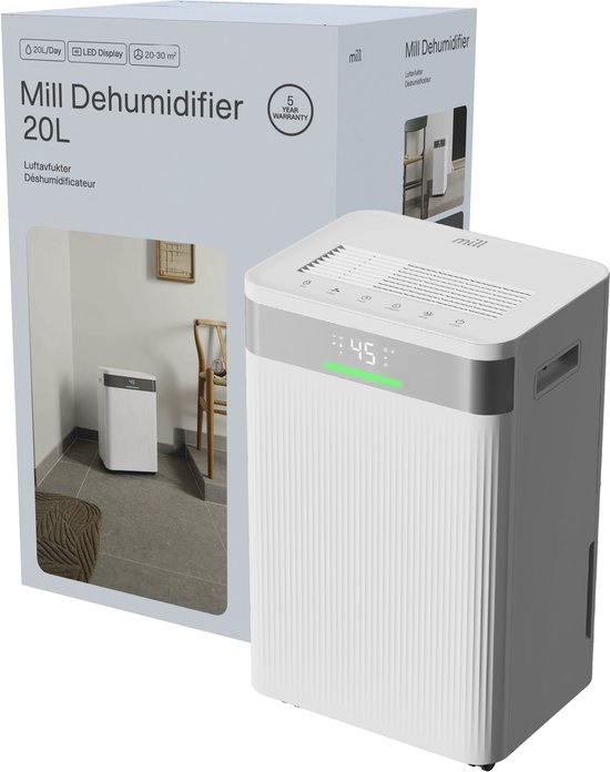 De Mill MDH20 luchtontvochtiger is een krachtig en elegant ontworpen toestel met een capaciteit tot 20 liter per dag. Hij zorgt voor een optimale luchtvochtigheid in huis en voorkomt effectief problemen zoals schimmel, vochtige muren en muffe geurtjes. Dankzij het stijlvolle Scandinavische design, het lage geluidsniveau en de gebruiksvriendelijke bediening is dit de ideale oplossing voor een gezond en comfortabel binnenklimaat. Slim en gebruiksvriendelijk ontwerp De MDH20 is uitgerust met een duidelijk LED-display, timerfunctie (1–24 uur) en kinderbeveiliging. Via de ingebouwde hygrometer lees je eenvoudig de actuele luchtvochtigheid af, terwijl de hygrostaat automatisch zorgt dat het ingestelde vochtigheidsniveau behouden blijft. Wanneer het waterreservoir van 4 liter vol is, geeft het apparaat een duidelijke waarschuwing. Voor continu gebruik kun je ook een afvoerslang aansluiten, zodat het water direct wordt afgevoerd. Stil en efficiënt in elke ruimte Met een geluidsniveau van slechts 38–41 dB werkt de MDH20 fluisterstil, ideaal voor gebruik in de slaapkamer, woonkamer of kantoor. De luchtontvochtiger is tevens geschikt voor koelere ruimtes, zoals de kelder of garage, want hij werkt betrouwbaar bij temperaturen vanaf 5 °C. Dankzij de wieltjes en het handvat verplaats je het apparaat eenvoudig naar de gewenste ruimte. Veelzijdige werking met drie programma’s De Mill MDH20 biedt twee ventilatorsnelheden en drie programma’s: Drogen (Laundry): droogt wasgoed sneller binnenshuis Automatisch: houdt automatisch de gewenste luchtvochtigheid aan Slaapmodus: zorgt voor stille werking tijdens de nacht Hoge ontvochtigingscapaciteit Met een ontvochtigingscapaciteit van tot 20 liter per dag is de MDH20 ideaal voor ruimtes van 20 tot 30 m². Het apparaat vangt het vocht op in het royale reservoir of voert het continu af via de slang. Zo blijft de lucht in je slaapkamer, kelder of woonkamer fris en droog. Voordelen van de Mill MDH20 Voorkomt schimmel en vochtproblemen: vermindert overtollig vocht en voorkomt vochtige muren Verbetert de luchtkwaliteit: vermindert allergenen zoals huisstofmijt en schimmels Zorgt voor een comfortabel binnenklimaat: minder benauwd, frisser en gezonder Beschermt meubels en elektronica: voorkomt vochtschade aan hout, vloeren en toestellen Snellere droging van wasgoed: ideaal voor vochtige ruimtes of bij slecht weer