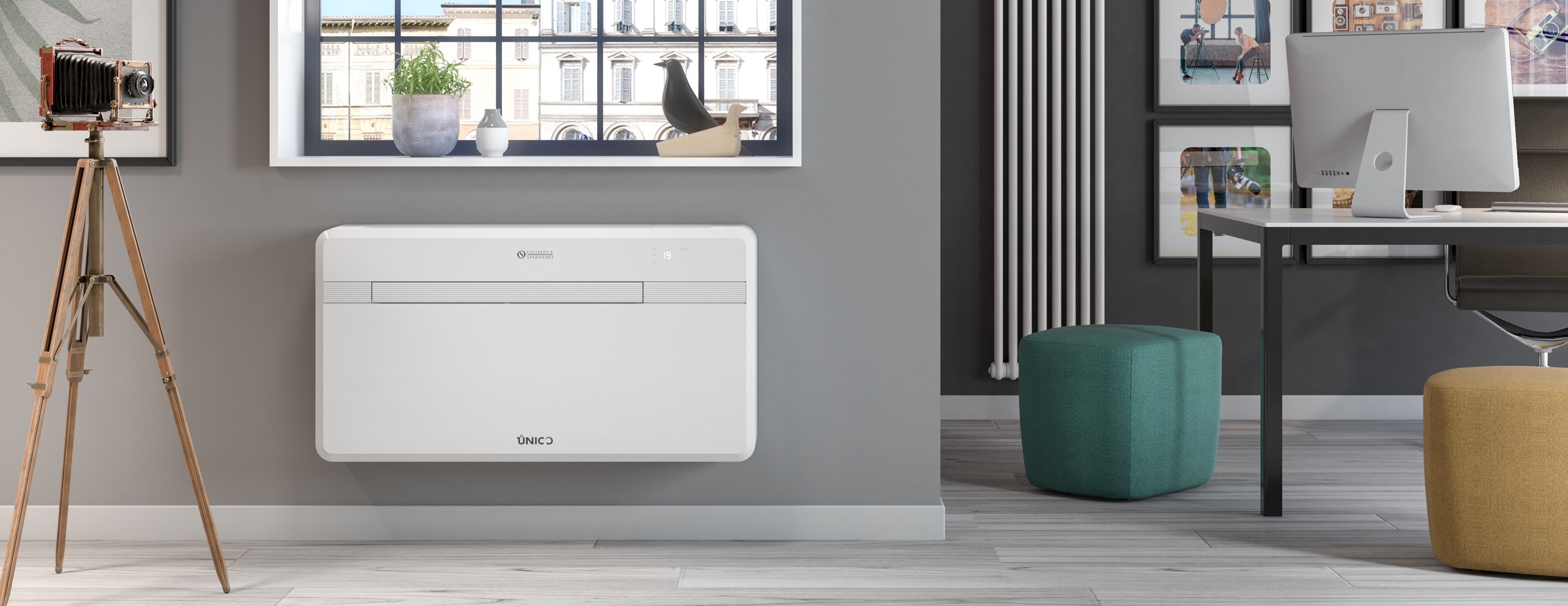 De stille monoblock airco Olimpia Splendid Unico EVO 25 HP PVAN is uitgerust met het SYNC POWER SYSTEM: het nieuwste type Twin Rotary compressor wordt gesynchroniseerd aangestuurd door geavanceerde elektronica. Onder alle bedrijfsomstandigheden zorgt dit voor het grootste akoestisch comfort. In de Silent Mode produceert hij maximaal 30 dB(A). De Unico EVO 25 HP PVAN warmtepomp airco is slechts 18 cm dik, hij beslaat weinig plaats. Geschikt voor koelen én bijverwarmen van een ruimte tot 28 m². Een airco zonder buitenunit, in een korte tijd te installeren. Géén opzichtige airco unit aan de buitenmuur, enkel twee ventilatiegaten en een klein gat voor de condenswaterafvoer!
