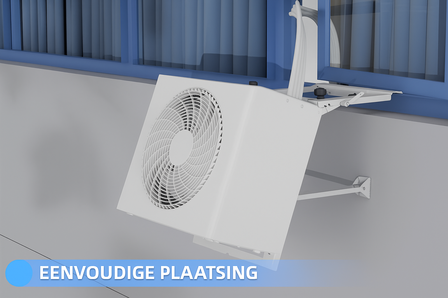 De buitenunit kan met de meegeleverde beugel eenvoudig aan een raam of balkon worden bevestigd. De compacte verbindingsbuis van slechts 2 meter lang en ongeveer 5 x 2 cm maakt het mogelijk om de opening tussen binnen en buiten minimaal te houden. Met het meegeleverde afdichtingsdoek en klittenband kan deze opening netjes worden afgesloten.