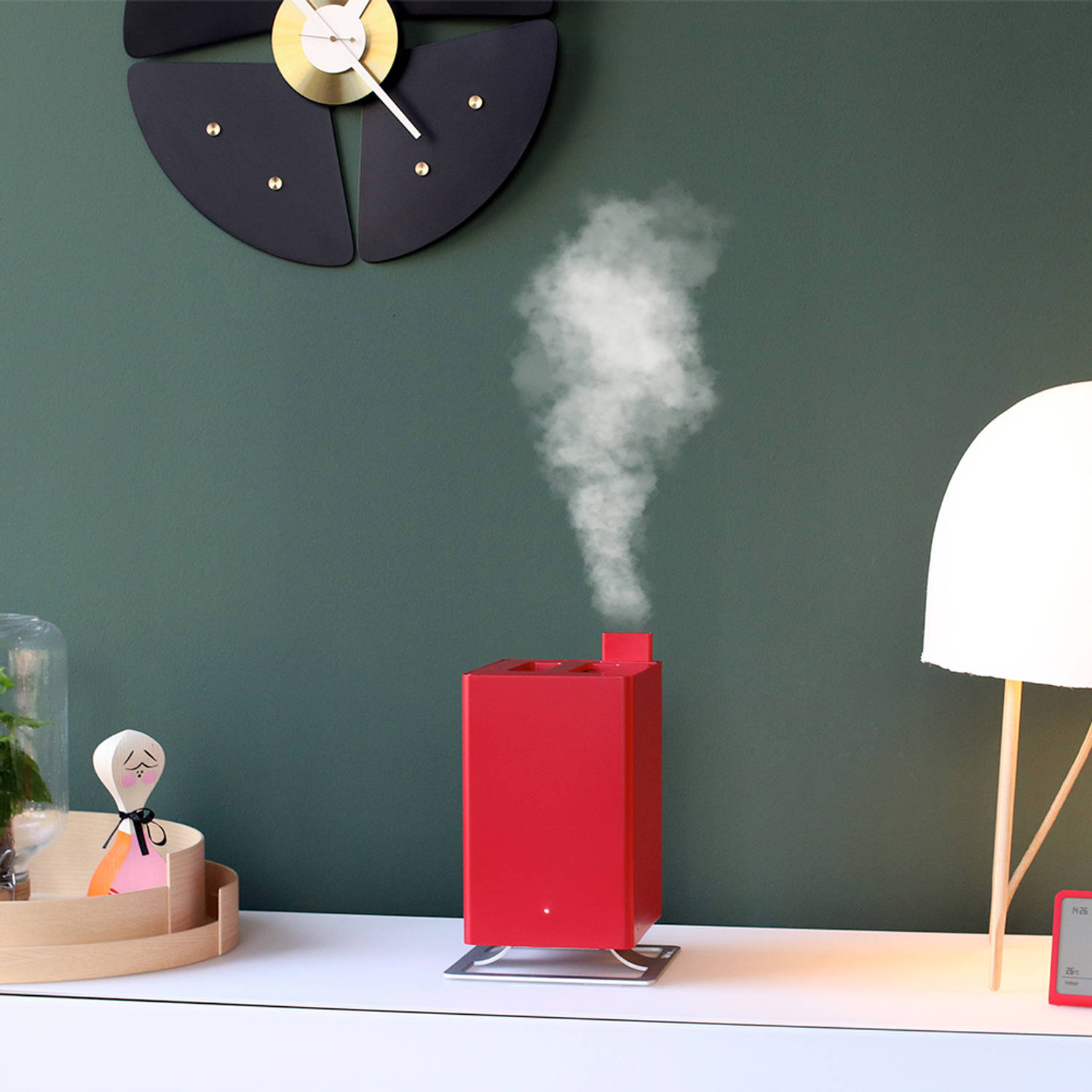 Koudwaterverdamper: Stadler Form Oskar, markante luchtbevochtiger voorzien van een ingebouwde hygrostaat. De strak vormgegeven bevochtiger bevat sfeervolle LED-verlichting met dimmer.