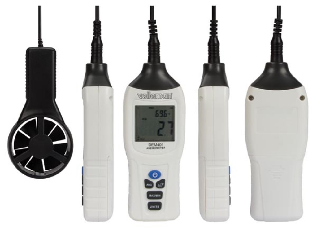 Digitale anemometer en thermometer Velleman DEM401 meet windsnelheid en temperatuur. De handzame windmeter heeft een bedrade sonde voor flexibel gebruik.