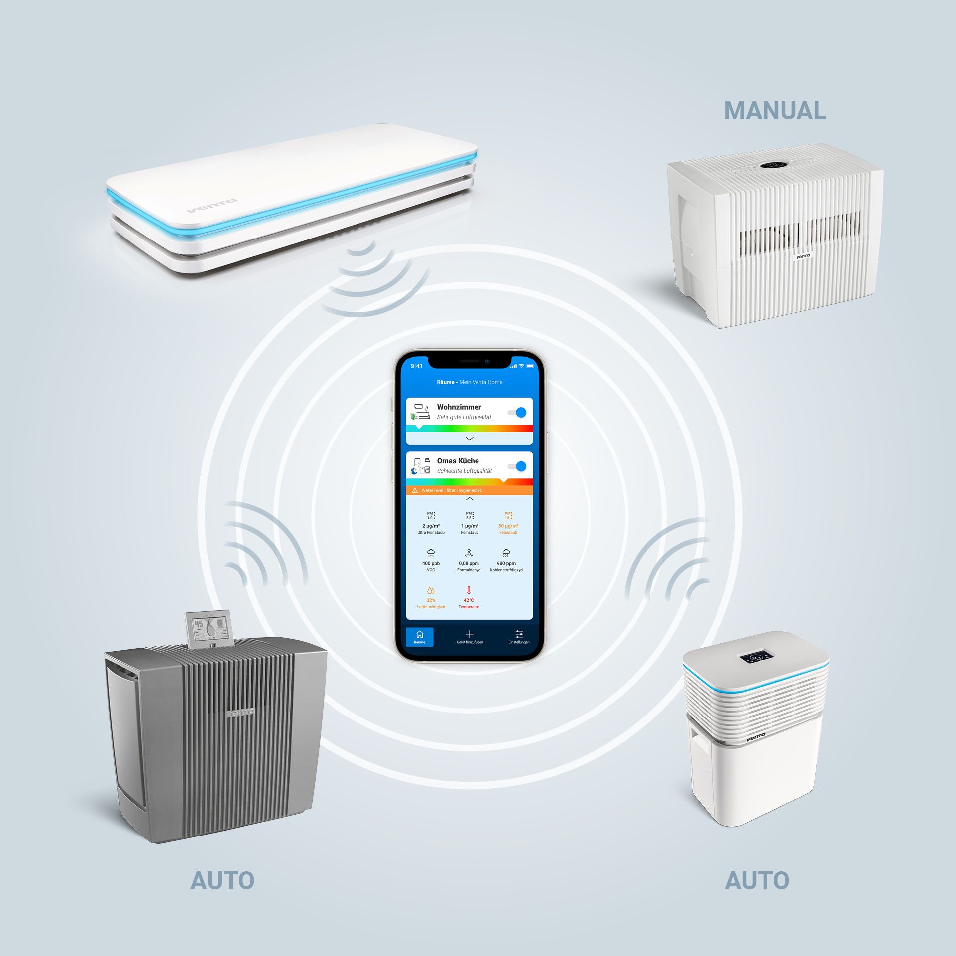 GEEFT INFORMATIE OVER ALLE BESTANDDELEN IN DE LUCHT Luchtvochtigheid, fijn stof of bijvoorbeeld CO2-gehalte: talrijke factoren hebben invloed op de luchtkwaliteit. Via de acht professionele sensoren meet, bewaakt en analyseert het apparaat op betrouwbare wijze in real time fijn stof (PM1.0, PM2.5, PM10), kooldioxide CO2, formaldehyde, VOC-gassen, luchtvochtigheid en temperatuur. Zo worden de bronnen van schadelijke stoffen in de lucht blootgelegd en wordt gezonder wonen gestimuleerd. De desbetreffende meetwaarden worden via de kleur van de LED-ring op de Venta AirSense weergegeven. Wanneer een waarde ideaal is, kleurt de ring groen. Zodra een waarde acceptabel is, wordt de LED-ring geel. En wanneer een waarde kritisch is, brandt de ring rood en krijgt u een waarschuwingsmelding via het apparaat of via de Venta Home-app. Daardoor heeft u een uitgebreid overzicht en weet u op elk moment hoe het met de luchtkwaliteit is gesteld. Voor uitleg over fijn stof, VOC-gassen, formaldehyde (link beneden) ALLES IN ÉÉN OOGOPSLAG MET DE VENTA HOME-APP De Venta AirSense Pro registreert de luchtgegevens die u in de Venta Home-app op elk moment in één oogopslag kunt bekijken. Zo is direct herkenbaar, wanneer er sprake is van een kritische waarde in een ruimte en er moet worden gehandeld. Bij kritische waarden ondersteunt de Venta Home-app met aanbevelingen voor handelwijzen en met informatie over mogelijke oorzaken. Eén blik in de app: Het CO2-gehalte is bijvoorbeeld verhoogd – tijd om stevig te ventileren. Tevens stelt de Venta Home-app meetwaardeanalyses op naar periodes – evaluaties per uur, per dag en per maand. Zo kunnen conclusies m.b.t. verandering van de luchtkwaliteit door dagelijkse activiteiten worden getrokken en gezonde gedragswijzen worden ontwikkeld. VOLLEDIG ZELFSTANDIG – OOK ZONDER VENTA-APPARATEN Heeft u nog geen Venta-Airwasher of -luchtreiniger, maar wilt u toch de luchtkwaliteit in het oog houden? Ook dan is Venta AirSense de juiste oplossing, want het apparaat functioneert onafhankelijk daarvan. Het geeft via de Venta Home-app informatie of de luchtkwaliteit in bijv. de kinderkamer of woonkamer goed is en wanneer u moet ventileren. En het geeft informatie, wanneer een Airwasher of luchtreiniger voor u de moeite waard zou zijn. INTELLIGENT SMART HOME-APPARAAT: COMMUNICEERT MET UW VENTA-APPARATEN De Venta AirSense is meer dan een binnenklimaat- en luchtkwaliteitsmeetinstrument. De meetwaarden worden verzonden naar Venta-apparaten die compatibel zijn met de Venta AirConnect, die al naargelang apparaattype automatisch op deze waarden reageren en beginnen te werken. In een woonkamer heeft de Venta AirSense Pro bijv. droge lucht geregistreerd en geeft dit door aan de Airwasher die meteen naar de volgende stand schakelt. Daardoor heeft u met de Venta AirSense niet alleen de lucht in uw ruimte in het oog, maar de apparaten die geschikt zijn voor wifi kunnen de gegevens automatisch gebruiken om zo voor optimale lucht in die ruimte te zorgen. AirSense, Venta Home-app, luchtreiniger, Airwasher en Hybrid-apparaten werken zo te allen tijde samen – als deel van AirConnect. KOOLDIOXIDE CO2, LUCHTVOCHTIGHEID, TEMPERATUUR Voor een optimaal binnenklimaat zijn essentiële factoren, zoals het juiste zuurstofgehalte, de optimale luchtvochtigheid tussen 40-60% en de temperatuur doorslaggevend. Met het Venta-apparaat houdt u deze waarden op elk moment in het oog, om gezondere lucht in een ruimte te bevorderen. FIJNSTOF DAT GEVAARLIJK IS VOOR DE GEZONDHEID PM1.0, PM2.5, PM10 Fijn stof is nagenoeg onzichtbaar en wordt ook wel zwevend stof genoemd, omdat het niet direct naar de grond daalt, maar een bepaalde tijd in de lucht blijft. Het ontstaat bijv. door auto’s, de industrie, de landbouw, maar ook bij een open haard. Daarom bevindt fijn stof zich niet alleen in het milieu, maar ook binnenskamers en wordt in belangrijke mate bepaald door de buitenlucht. De concentratie fijn stof in een woning kan verschillend zijn. Duidelijk is dat ventileren een belangrijke bijdrage levert. Volgens het Umweltbundesamt (centrale wetenschappelijke milieu-instantie van Duitsland) dienen bekende bronnen van fijn stof in een ruimte consequent te worden opgespoord en tot een minimum te worden beperkt. Onze Venta AirSense Pro helpt u bij het opsporen van deze bronnen. VOC-GASSEN VOC-gassen (Volatile Organic Compounds) zijn vluchtige gas- en dampvormige stoffen van organische oorsprong in de lucht. Mogelijke bronnen van VOC-gassen in binnenruimten zijn bouwproducten of alledaagse voorwerpen die deze gassen uitscheiden. Dit zijn bijvoorbeeld vloer-, wand- en plafondmaterialen, verf, lak, lijm, meubels, elektrische apparaten of speelgoed. Om die reden komen ze zo goed als altijd in de lucht voor, maar meestal in geringe hoeveelheden. Bij hogere percentages kunnen ze lichamelijke klachten veroorzaken, bijv. allergieën, en daarom is het belangrijk deze waarden in het oog te houden. FORMALDEHYDE Formaldehyde is een stof die wordt gebruikt als bestanddeel van lijm. In 2014 werd deze door de EU geclassificeerd als “kan kanker veroorzaken”. De belangrijkste bronnen zijn bijv. houten materialen, vloerbedekking, meubels, isolatiematerialen en bouwproducten. Deze kunnen formaldehyde aan de lucht in een ruimte afgeven. Meubels die in Duitsland en in de EU worden gemaakt en verkocht voldoen in het algemeen aan bepaalde emissievoorwaarden (herkenbaar aan de aanduiding “emissiearm E1”). Bovendien bevat ook tabaksrook formaldehyde en het kan ontstaan bij brandende kaarsen. Houd de concentratie met AirSense in het oog om eventueel maatregelen te kunnen nemen. AS150 AIRSENSE PRO Professionele binnenklimaat- en luchtkwaliteitsmeter Adviseur voor gezonde lucht in een ruimte Bewaakt en analyseert in real time met maar liefst 8 professionele sensoren bestanddelen in de lucht Visualisatie van de meetwaarden in real time via de kleur van de LED-ring In één oogopslag gedetailleerde informatie over afzonderlijke meetwaarden in de V