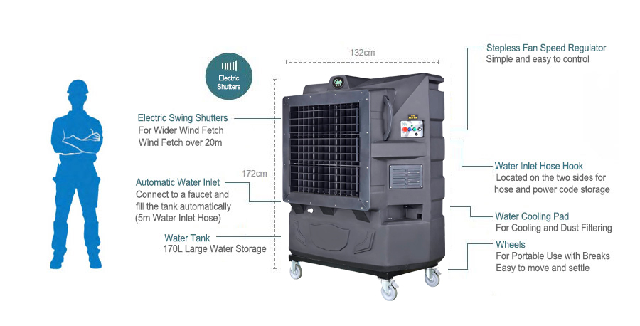 De Ya Suh Dar M703-COOL is een mobiele, adiabatische luchtkoeler voor professioneel gebruik. Dit model maakt deel uit van de Ya Suh Dar-serie en is ideaal voor het koelen van binnen- en buitenruimtes.